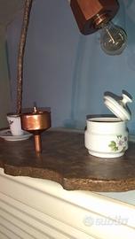 lampada da tavolo composta da cafettiera sospesa con tazzina e zuccheriera,con accensione sul filtro caffè.