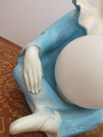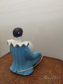Pierrot con vestito azzurro, seduta, con palla contenente lampadina