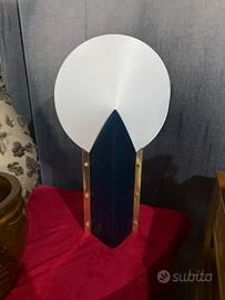 La lampada si distingue per il suo design scultoreo: una base a colonna piramidale bicolore (blu e bianco) impreziosita da profili laterali in ottone dorato con borchie a vista. Il diffusore superiore è un grande disco metallico bianco che riflette la luce in modo morbido e indiretto, creando un'atmosfera elegante e soffusa.