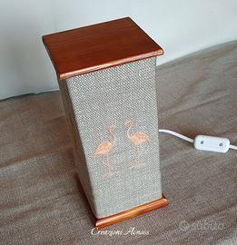 Lampada da tavolo artigianale con tessuto misto cotone e ricami su tre lati (Fenicotteri e arcieri (bronzetti). base e top in legno massello con finitura all'acqua. adatta anche come abat jour. Misura B cm 12 x H cm 20.