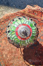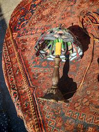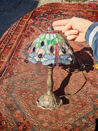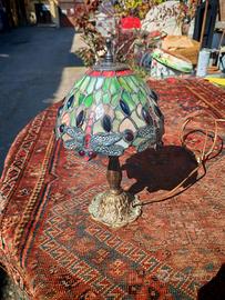 Lampada da tavolo in stile Tiffany, caratterizzata dall'iconico decoro a libellule. Paralume realizzato artigianalmente con tasselli di vetro colorato (toni del verde, rosso e ambra) e gemme di vetro incastonate. Il bordo irregolare segue il disegno delle ali delle libellule. Base in ottone con decorazioni floreali a rilievo e finitura bronzata antica, molto stabile. I vetri opalescenti creano riflessi multicolore unici. Condizioni ottime, i vetri sono integri, senza crepe. Impianto elettrico funzionante con interruttore lungo il cavo. Misure: altezza 35 cm, diametro paralume 20 cm