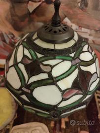 Splendida lampada da tavolo stile Tiffany, con paralume in vetro colorato lavorato a mano secondo la tradizionale tecnica del mosaico. La base è in metallo con finitura bronzo anticato, solida e decorativa.