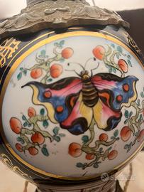 favolosa lampada da tavolo antica in porcellana dipinta a mano blu china con fiori, con abat-jour in seta rossa su base quadrangolare. In perfette condizioni, vendo per motivi di spazio.