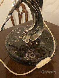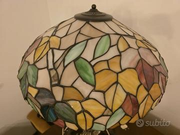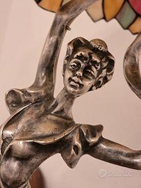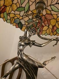Vendo raffinata lampada da tavolo in stile Tiffany e Liberty (Art Nouveau), ideale come pezzo d’arredo elegante e di grande impatto scenografico. La lampada è composta da un paralume a cupola in vetro policromo tipo Tiffany, realizzato con tessere irregolari assemblate a piombo, in tonalità calde e pastello (ambra, giallo, verde, azzurro e rosa).La base è una scultura in metallo fuso, raffigurante una figura dinamica ispirata al gusto Liberty, poggiante su un basamento circolare in marmo scuro venato. Oggetto decorativo di qualità, perfetto per salotto, studio, ingresso o ambiente classico‑elegante. Caratteristiche Stile: Tiffany / Art Nouveau (Liberty) Periodo: seconda metà del Novecento Paralume: vetro policromo tipo Tiffany Base: metallo con patina e marmo Impianto elettrico funzionante (non originale) Condizioni: buone, normali segni del tempo Dimensioni indicative Altezza: circa 50–55 cm Diametro paralume: circa 40–45 cm Prezzo €350 trattabili