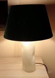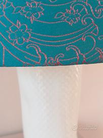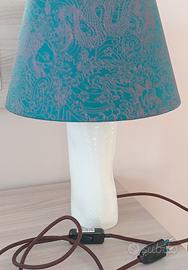 Propongo lampada da tavolo artigianale, interamente fatta da me, base ceramica bianca lucida e paralume in velluto a tronco di cono color ottanio/petrolio con dettagli color bronzo.