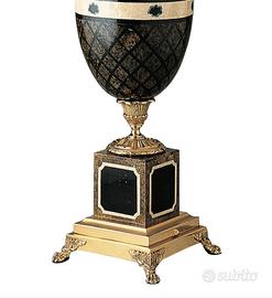 Lampada da tavolo "Ulmus" Laudarte, caratterizzata da inserti in fusione di bronzo 24K e cristallo, decorata nella parte centrale da conchiglia nera di sfondo e conchiglia color tartaruga, il tutto circondato da un contorno in madreperla dorata. Il paralume é in plissé di seta nero.
