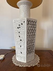 L'oggetto presenta una base scultorea esagonale in ceramica bianca smaltata, finemente lavorata con decori floreali a rilievo e caratteristiche sezioni traforate a nido d'ape, tipiche della tradizione artigianale veneta del periodo Mid-Century. Condizioni come da foto. Dimensioni parte in ceramica 40x16 cm
