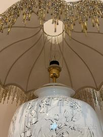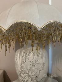 Elegante lampada in stile classico/retrò con base in ceramica bianca decorata con motivi floreali grigi e dettagli dorati. Paralume a cupola con frange di perline dorate e trasparenti. Perfetta come complemento d’arredo o oggetto da collezione