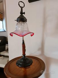 Lampada da tavolo vintage in ferro e legno. Paralume in vetro colorato. Filo e interruttore originali. Un po' graffiata la parte in legno (vedi foto). Altezza complessiva 50 cm. Diametro del paralume 18 cm circa.