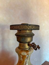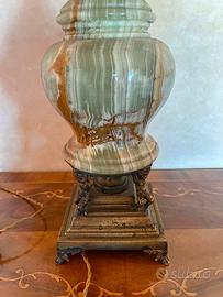 Elegante lampada da tavolo vintage con base in onice naturale e dettagli in metallo lavorato. Il paralume originale, in tessuto beige con finiture in passamaneria e nappine, conferisce un tocco raffinato e retrò, ideale per arredamenti classici.