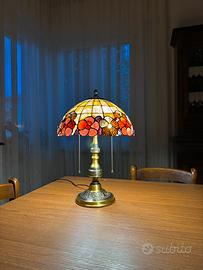 Elegante riproduzione di una lampada da tavolo in stile Tiffany, realizzata con un paralume in vetro colorato saldato a mano. Il motivo floreale, ricco di dettagli e tonalità calde, crea un effetto luminoso avvolgente e raffinato.