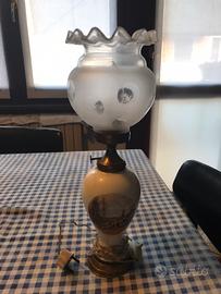 Lampada da tavolo vintage in ceramica raffigurante una scena di caccia inglese e vetro soffiato e opaco lavorato, anni 60,Perfettamente Funzionante altezza 39cm