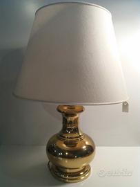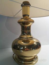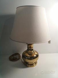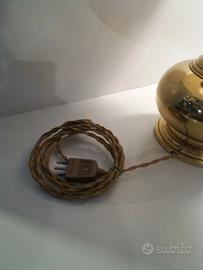 Lampada da tavolo vintage anni 80 con base in ottone, cavo in tessuto e paralume bianco.