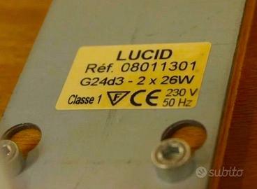 Lampada da tavolo mod. "CULOT" grande G24D3, dal design nordico, tipica degli anni 80. La sua particolare struttura si integra perfettamente in diversi ambienti. Attribuibile a Soren Eriksen prodotta da Lucid Lampes (F). Base rotonda in legno con finitura alluminio, stelo centrale in legno, paralume in legno curvato a forma di cono con dettagli traforati e inserto laterale in metacrilato bianco. Ottime condizioni, lievi segni del tempo. Misure HxL 63x50 diametro 25, peso ca. 6 kg.