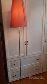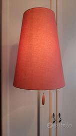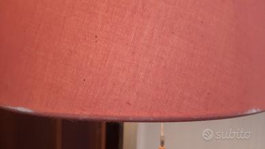 Bella lampada da terra a stelo in metallo con paralume in stoffa rigida color pesca/corallo e cordina con accessorio in legno per spegnere/accendere, completa di lampadina.
