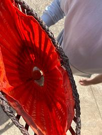 Lampada arancio con inserti di legno color ebano. Usata ma tenuta bene, quando si accende riflette l’occhio di Ra sul soffitto. Alta circa 155 cm