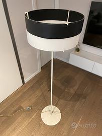 La struttura è in metallo verniciato bianco con base circolare stabile e stelo sottile. Il paralume cilindrico è composto da una fascia superiore in pelle nera e da una parte inferiore in vetro/ceramica bianca (diffusore).
