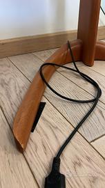La base ad U, che sorregge lo stelo ad arco (massima larghezza dello stelo nella parte inferiore: cm.18), è larga cm.50 e profonda cm.60 mentre lo spessore in altezza va da cm. 6 a 4. La massima altezza della lampada, che finisce a ricciolo (dove va inserito il paralume), è di cm.184: la parte lignea è in perfetto stato e nella parte posteriore, ha una scanalatura a tutta altezza per l'inserimento del filo elettrico. La lampada da terra degli anni 50 è venduta a richiesta con il paralume in tela di pergamena diametro 60 cm nella parte più larga e altezza 25 cm dotato di anello per essere appeso allo stelo. Nell’immagine è visibile un deterioramento del paralume, presente sin dal mio acquisto dell’oggetto: la comprai al fine di restaurarla ma non ne ebbi mai il tempo. Questi difetti mi portano a scontare di molto l’articolo, per cui essendo il prezzo conveniente non lo ritengo ulteriormente trattabile. Se posizionata nei pressi di un divano o vicino a un mobile, questi dettagli sono impercettibili.