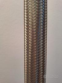 Realizzata in acciaio inox intrecciato, con finiture di pregio e una plafoniera in vetro soffiato, la lampada offre una luce calda e dimmerabile per creare atmosfere su misura. Il basamento rivestito con pellicola di pregio è personalizzabile, pensato per chi desidera un tocco unico nel proprio living o studio.