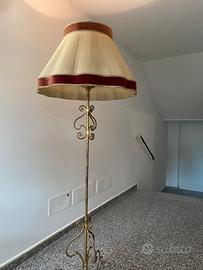 Lampada da terra in ferro battuto dorato con paralume plissettato e con finiture in raso, doppia illuminazione come da foto leggermente trattabile