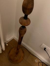 Vendo per inutilizzo lampada da terra con base in legno lavorata e cappello beige con profili neri. Pende leggermente da un lato.