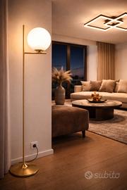 NUOVA lampada da terra stile moderno con una sfera di vetro 20 cm. Asta metallica dorata di 150 cm e una base rotonda stabile di 25 cm. Cavo lungo 2 metri. È compatibile con lampadine di tipo E27 (non inlcusa).