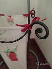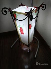 Lampada da terra in ferro battuto con paralume in cotone con fiocchetti in raso in tinta con la fantasia floreale.