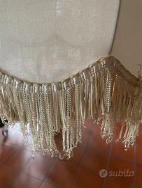 Elegante lampada da terra vintage, completa di paralume in tessuto con frange decorative e sostegno in metallo color ottone.