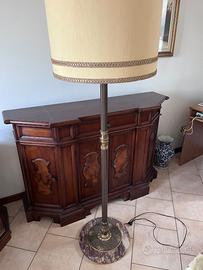 lampada da terra (piantana) in stile classico, con fusto a colonna scanalata in ottone o bronzo e una base circolare in marmo. paralume in tessuto plissettato di colore crema, rifinito con una passamaneria decorativa a intreccio lungo i bordi superiore e inferiore