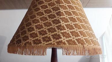 Lampada da terra in Stile oro damascato usata, in noce, bastone liscio con inserti di metallo dorato intagliato Dimensioni: piantana in legno diametro 39 cm, altezza totale 190cm, paralume oro con frangia diametro 65, frangia danneggiata da sostituire,