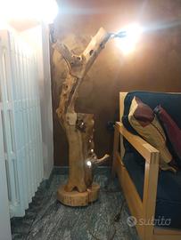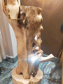 Lampada unica realizzata in legno d' Ulivo secolare con due punti luce agli estremi e led interno al tronco alla base con raggi di luce dai fori naturali del legno.