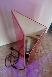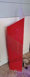 Questa lampada da terra è stata disegnata da Lorenzo Carmellini e Federico Rezzonico per Tronconi anni ’70 ed appartiene alla serie I Personaggi con lampade che si ispirano tutte a forme geometriche slanciate, con vari colori, a tinte piene, con inserti di fessure che corrono, continue, su tutte le pareti