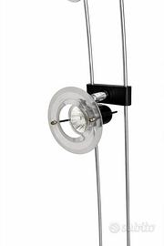 Struttura con doppia asta in metallo cromato, base e supporti neri, due faretti orientabili con diffusori in vetro trasparente. Linea pulita e moderna, tipica del design fine anni ’90 / primi 2000.