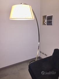 Bellissima lampada piantana di design ad arco, marchio Natuzzi, modello Wisdom, struttura in nichel, con paralume conico in shantung di seta avorio. Misure: