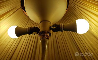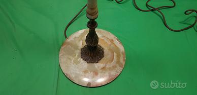 ATTENZIONE: LEGGERE ATTENTAMENTE Antica lampada fine anni '50 in onice e ottone intervallati. Usato, in ottime condizioni perfettamente funzionante. Base in onice - Impianto elettrico ristrutturato c/completa sostituzione dei conduttori tranne quello di alimentazione. Tramite l'interuttore a pulsante a terra si accende il portalampada centrale moderno con accensioni separate, i due portalampada laterali, in ottone e porcellana antichi, hanno cadauno interruttori singoli in porcellana incorporati nei portalampada. Paralume in seta. Mis. cm. 172 h. - paralume cm. 71 parte bassa e cm. 36 apertura alta - base onice cm. 30. Peso complessivo kg. 9 - SOLO RITIRO