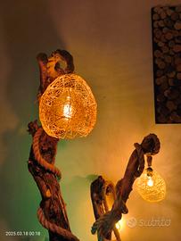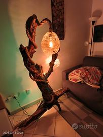 lampada da terra in ulivo realizzata interamente a mano, con tre luci calde ed un led incastonato nel legno.
