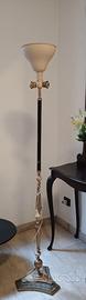 Lampada da terra vintage con fusto in legno e ottone, inserti in pietra naturale onice grigio/verde e base in marmo 3, luci indipendenti h.175 cm. paralume perfettamente integro . Visionabile a Milano.