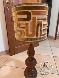 Base in legno tornito con finitura calda e paralume originale in tessuto vellutato con motivo geometrico tipico dell’epoca.