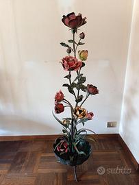 Affascinante e scenografica lampada da terra a forma di rosa, realizzata interamente in metallo dipinto a mano. La struttura presenta numerosi fiori tridimensionali (rose) dai colori vivaci – rosso, rosa e giallo – con diffusori interni per lampadine, che rendono l’effetto luminoso suggestivo e decorativo. La base è lavorata a foglie aperte, con gambe arcuate e cavo originale dotato di interruttore. Oggetto d’arredo unico, ideale per ambienti vintage, shabby chic o eclettici.