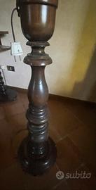 Lampada anni 80 con struttura in legno, paralume in tessuto tipo raso, passamaneria e frange decorative.