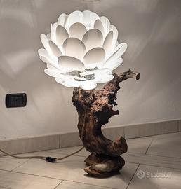 lampada da tavolo o da terra, realizzata a mano, la struttura è in legno di ulivo riciclato, trattato ad olio, finitura lucida. paralume in PVC bianco a forma di fiore di loto, portalampada E27 stile vintage industriale colore ottone, cavo di alimentazione in corda di canapa.