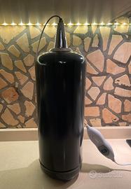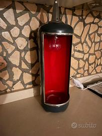 Lampada design Estintore prodotta artigianalmente utilizzando un estintore che è stato accuratamente verniciato di grigio scuro, all’interno è stato posto un pannello rosso di velluto, e il fondo è stato verniciato di rosso. È stata estratta la parte superiore che si avvita che serve per spruzzare il getto di polvere e al suo posto è stato collocato all’interno un portalampade grigio e rosso. Nella parte superiore esterna è stato posto alla base un anello cromato e sopra di esso un cono cromato dal quale fuoriesce il filo dell’alimentazione. L’interruttore con piccola illuminazione azzurra, può fornire due gradazioni di luce: una più tenue e una più forte. Ho inserito una lampadina a incandescenza che si conforma maggiormente allo stile della lampada. Come cornice della parte che è stata tagliata, è stato inserito un profilo cromato. Altezza complessiva 52 cm, diametro 15 cm, cinque, peso complessivo 4 kg. In caso di spedizione verrà effettuata con molta cura per impedire qualsiasi danno. La lampadina non verrà spedita per evitare che si rompa, così potrete decidere voi quale tipo di lampadina inserire.