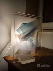 Lampada design vintage in plexiglass composta da base, 3 lastre con inserimento di strisce di tessuto e lastra di inserimento della luce, marchiata "Ortecnica srl Vibo - prodotti per il disegno"