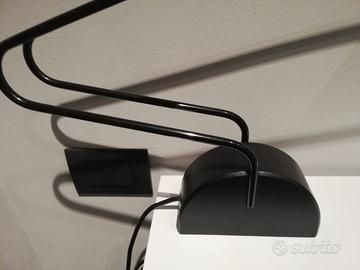 Lampada da tavolo vintage, design minimalista postmoderno, in metallo e plastica nere, con impostazioni di luminosità alta e bassa tramite interruttore cromato laterale. Altezza 41 cm, larghezza 66 cm, profondità 6 cm.