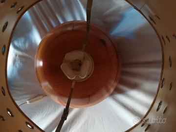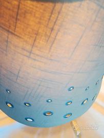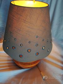 La base è realizzata in legno massiccio, caratterizzata da un design a doghe a segmenti torniti che le conferiscono una forma arrotondata e un aspetto naturale. Il paralume è in tessuto grigio/blu con un motivo distintivo di fori circolari ricamati, che creano un particolare effetto luminoso quando la lampada è accesa. Questo stile è spesso associato al design svedese o danese dell'epoca. Ritiro zona Binasco (Mi) disponibile spedizione carico acquirente