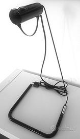 Lampada da tavolo Slalom (modello 279) disegnata dall'architetto designer Vico Magistretti negli anni '80 dello scorso secolo e prodotta dall'azienda italiana Oluce. La struttura è costituita da un tubo in acciaio verniciato nero sagomato a C che funge da base e da cui fuoriesce uno stelo che si puo' muovere sul piano verticale (dal basso verso l'alto o viceversa) permettendo diverse inclinazioni della lampada e quindi della luce. Il riflettore, anch'esso orientabile mediante una speciale maniglia, è costituito da un cilindro di lamiera opportunamente ritagliato per la fuoriuscita della luce e per la dispersione del calore. La lampada è stata inserita dal 1983 nella collezione permanente del "Neue Sammlung" di Monaco di Baviera e dal 1990 del "Museum fuer Angewandte Kunst" di Colonia. La base misura cm 25x25, l'altezza massima è di 50 cm, che naturalmente varia in base a come viene orientata. Le condizioni sono molto buone, nella parte sottostante la base, e quindi non visibili, si notano alcuni segni legati all'età e all'utilizzo.