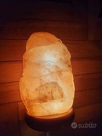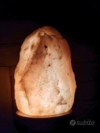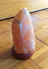 Lampada di sale dell’Himalaya, in pietra grezza di colore rosa naturale, con base in legno, alta circa 20 cm, peso di 1,5-2 kg.