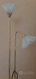 Elegante lampada da terra h 180cm circa in metallo verniciato oro, con due diffusori in vetro sfumato in bianco a forma di fiore per lampadine G4 LED ed interruttore azionato a pedale;