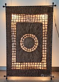 Quadro che è anche lampada (220V). Pezzo unico e artigianale, interamente fatto a mano, con fibre naturali, non ne trovi un altro uguale. Predisposto per essere appeso sia verticalmente che orizzontalmente. Comprensivo di 4 lampadine alogene che possono anche essere sostituite con lampadine LED ad intensità e colore preferiti. Misure 130x90.