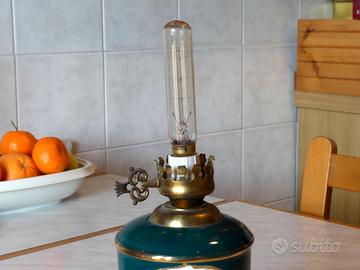 Lampada elettrica in stile, con base in porcellana verde decorata sul frontale. Nell'aspetto vuole imitare una lampada a petrolio, di cui ha la struttura generale. Cavo elettrico non molto lungo (un metro circa) con interruttore, tutto perfettamente funzionante. Un bell'oggetto decorativo che, all'occorrenza, ha una sua utilità. Altezza 35 cm., larghezza 11 cm.